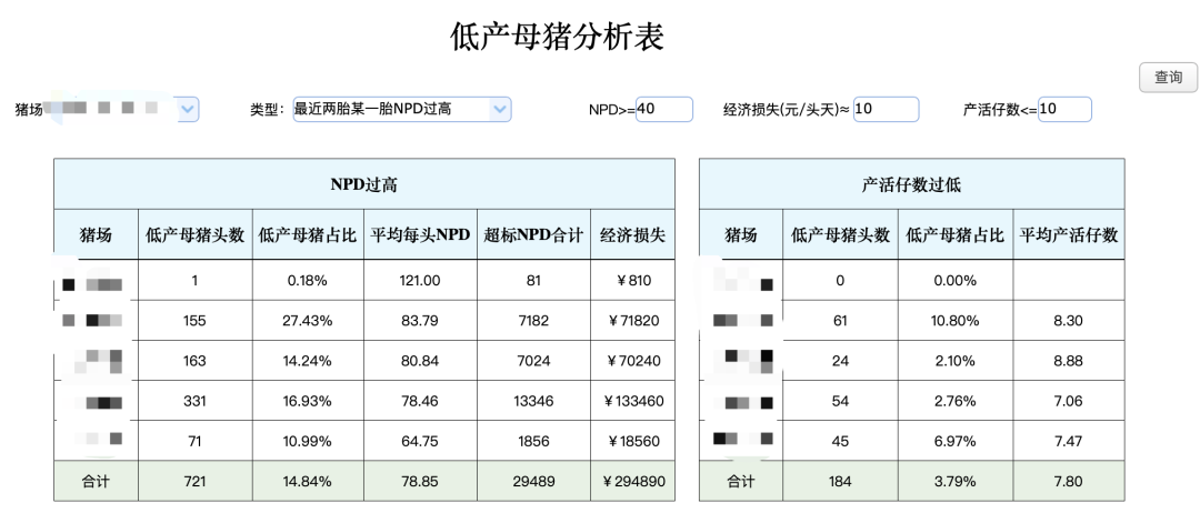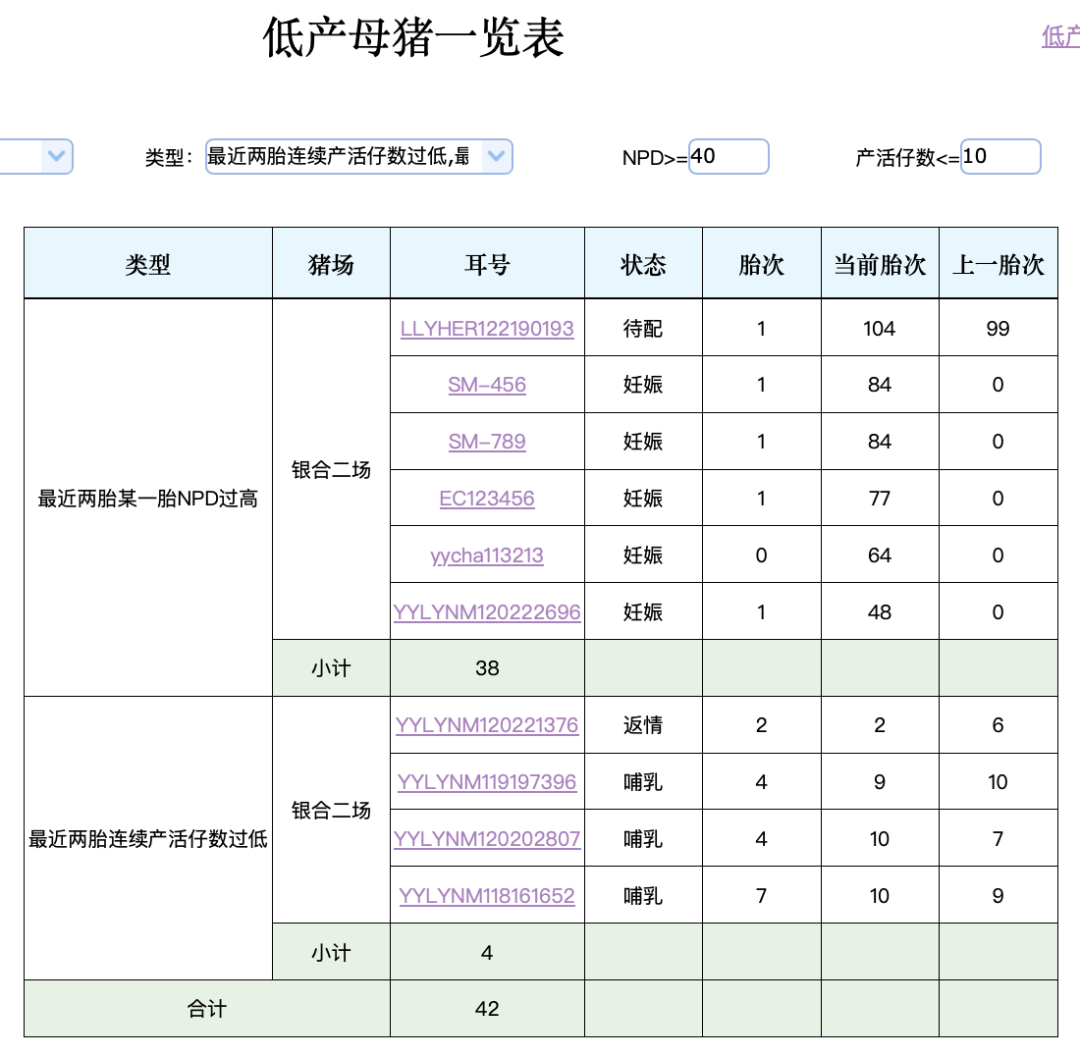 1、通过软件的低产母猪一键查询功能,猪场能快速找出低产母猪,穿透至母猪档案,了解造成低产的具体原因,然后决定是否淘汰,大大解决了靠人工无法第一时间发现低产母猪而造成严重浪费的现象,显著提供PSY,降低成本。
