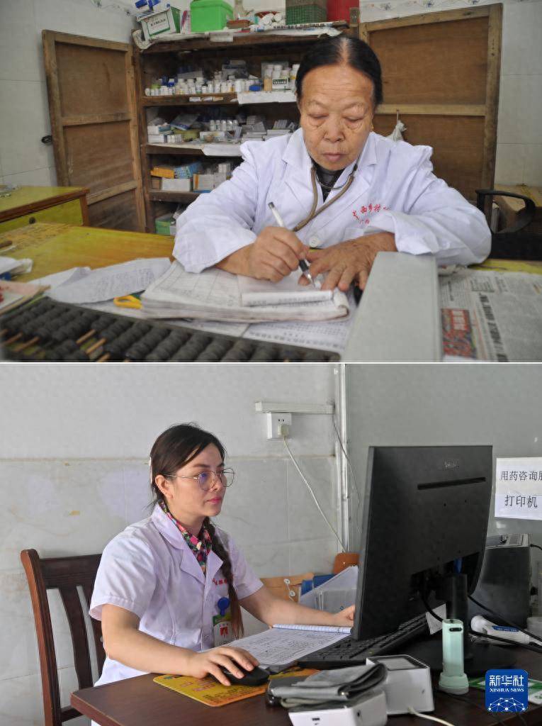 这是一张拼版照片在线配资开户网站。上图:杜桂梅医生在高岭村卫生室为病人手写处方(2011年12月7日摄)。下图:潘雪梅医生在高岭村卫生室用电脑录入病人信息(2025年8月18日摄)。